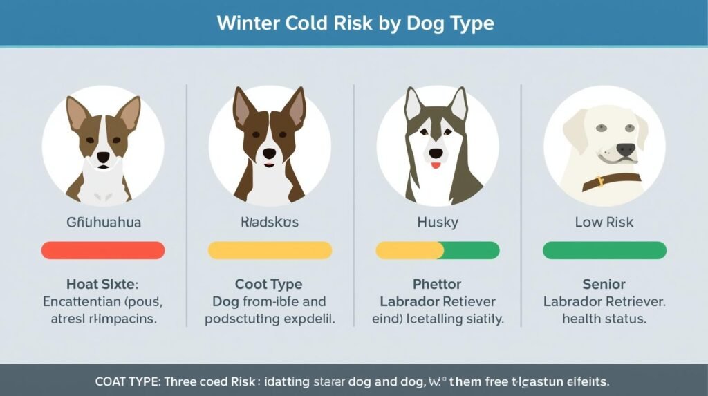 • Lower risk: Double-coated (Huskies, Malamutes, Shepherds)—but even they can get cold in extreme wind or wetness